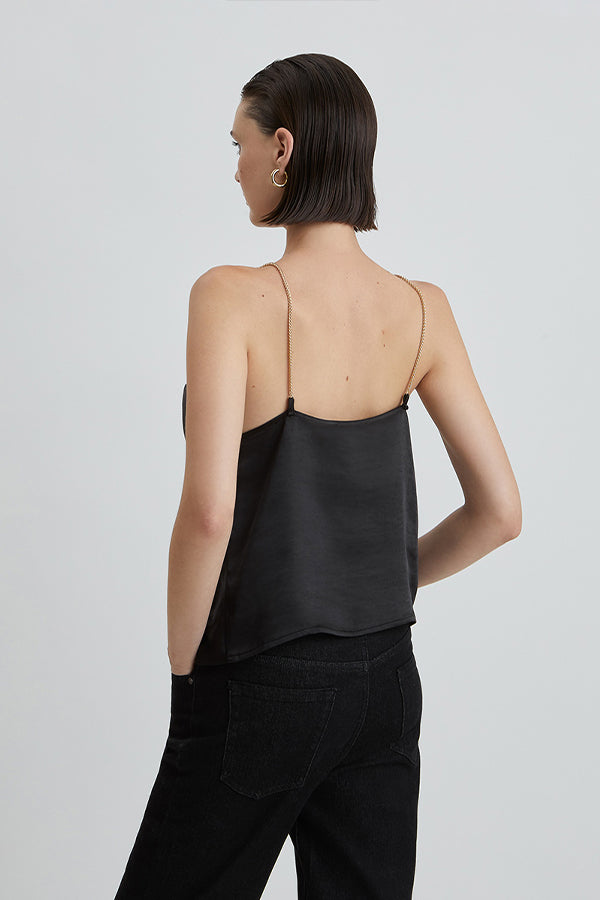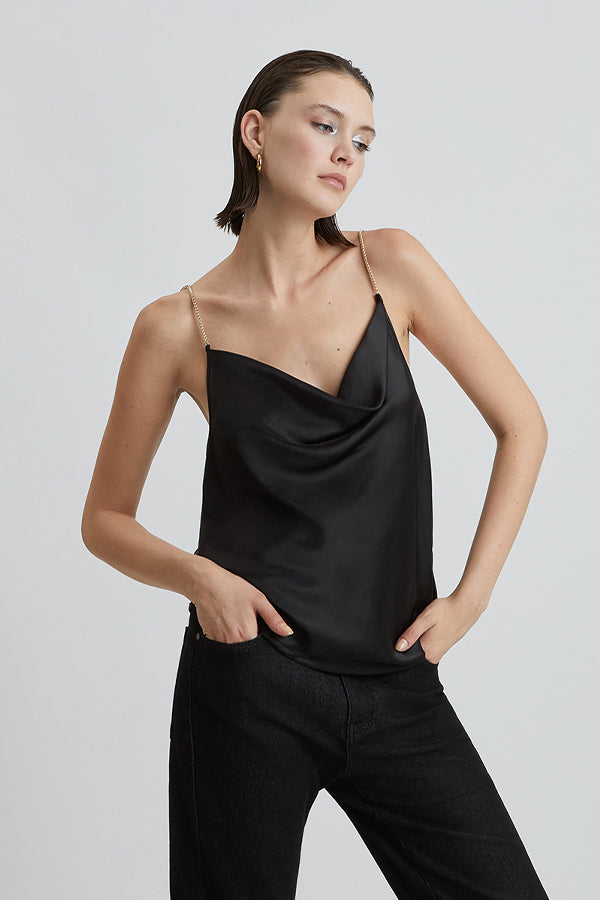 Top con escote drapeado y tirante de cadena dorada, realizado en tejido de satén.