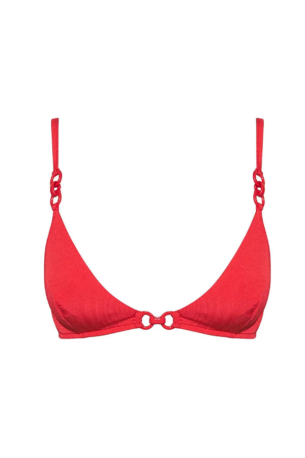 Top de Bikini Triángulo sin aros, con pieza ligera en la sisa para mejor sujeción y colocación del busto, además de forro interior con pinza. Escote invisible, detalle decorativo en delantero y tirante. Tirante fino desmontable rematado en pieza en forma de 's' dorada, para doble posición de atado al cuello