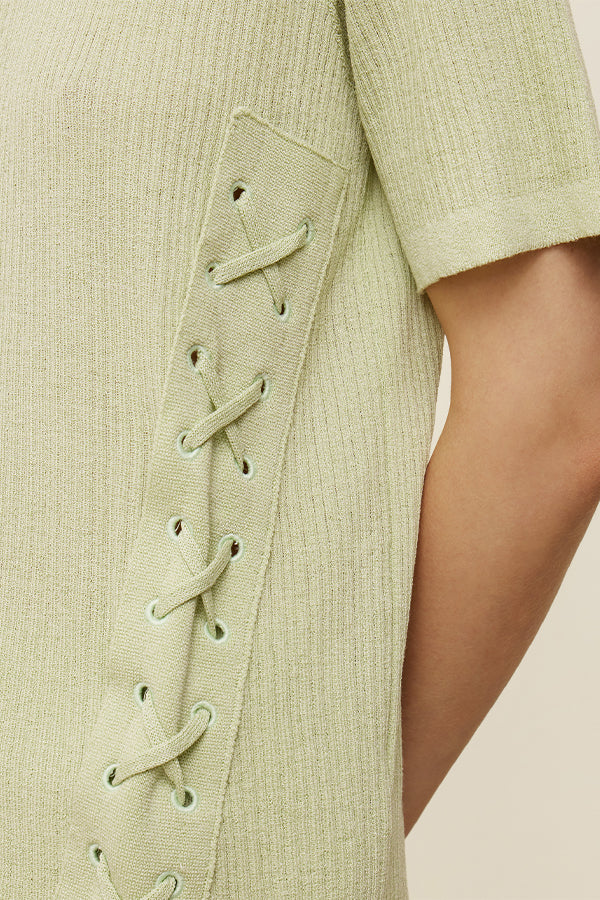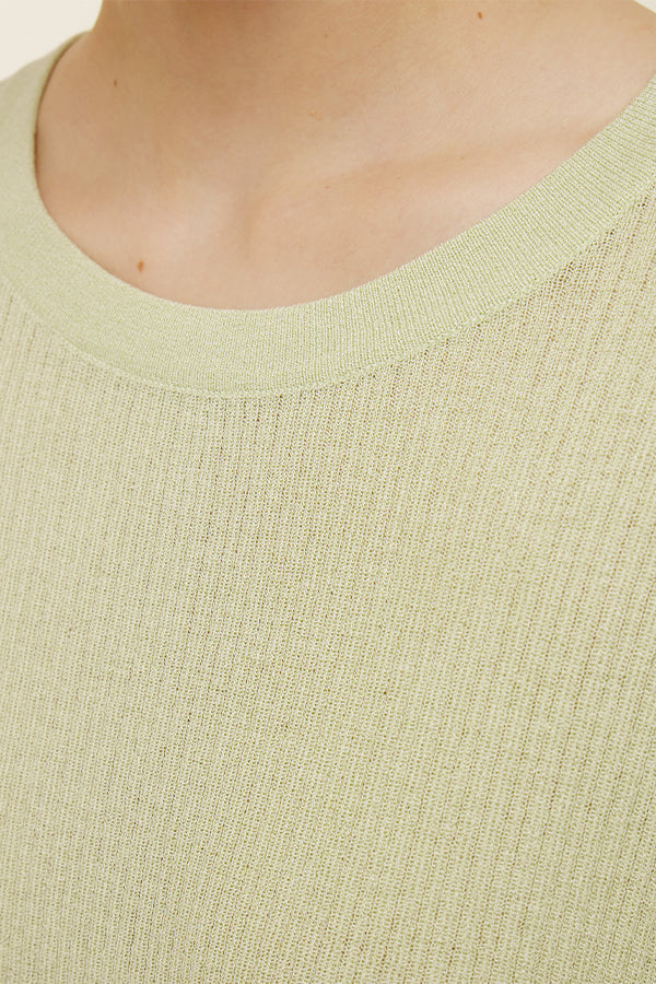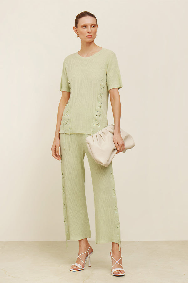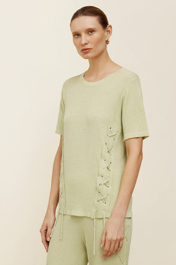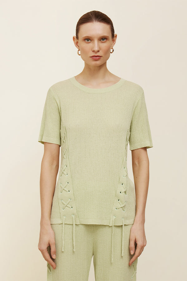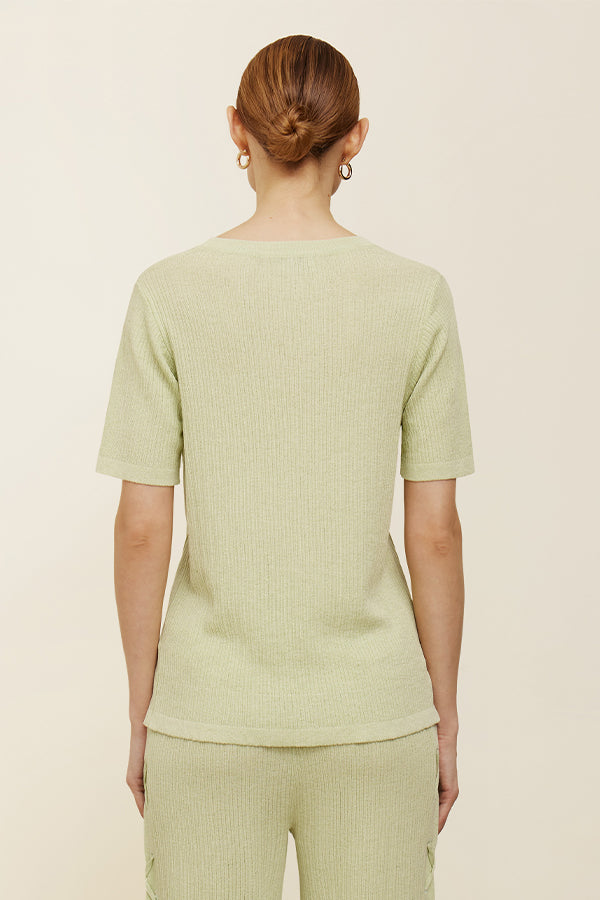 Top de tricot con escote caje y manga corta. Detalle de eyelets decorativos en el delantero.
