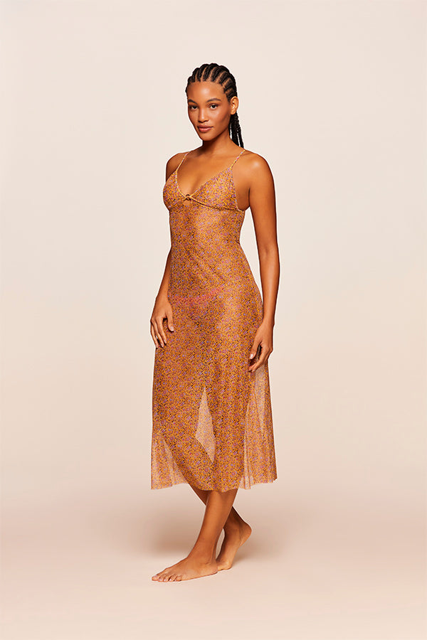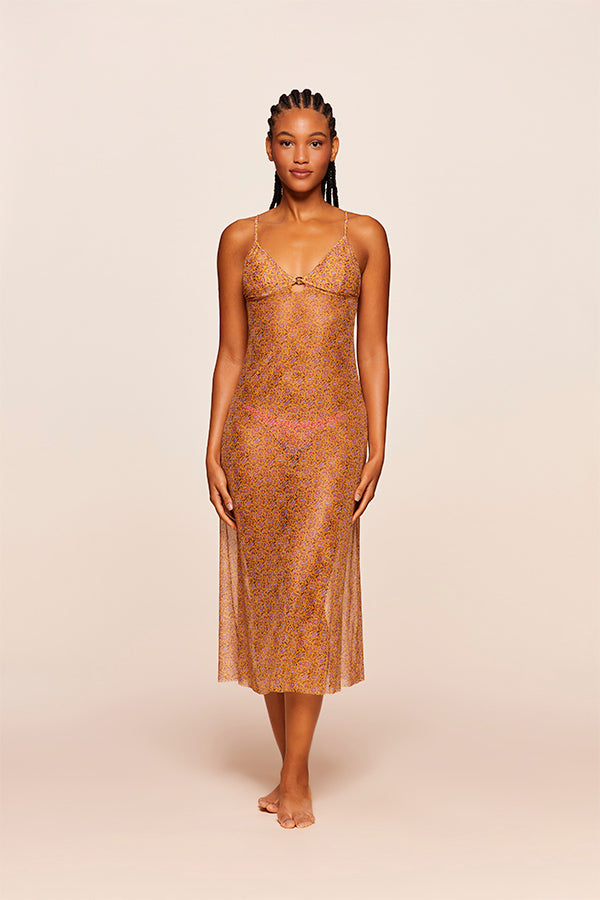 Vestido midi de tul transparente ,con detalle de aro en el escote, tirantes paralelos ajustables, modelado fluido y copa extraíble.