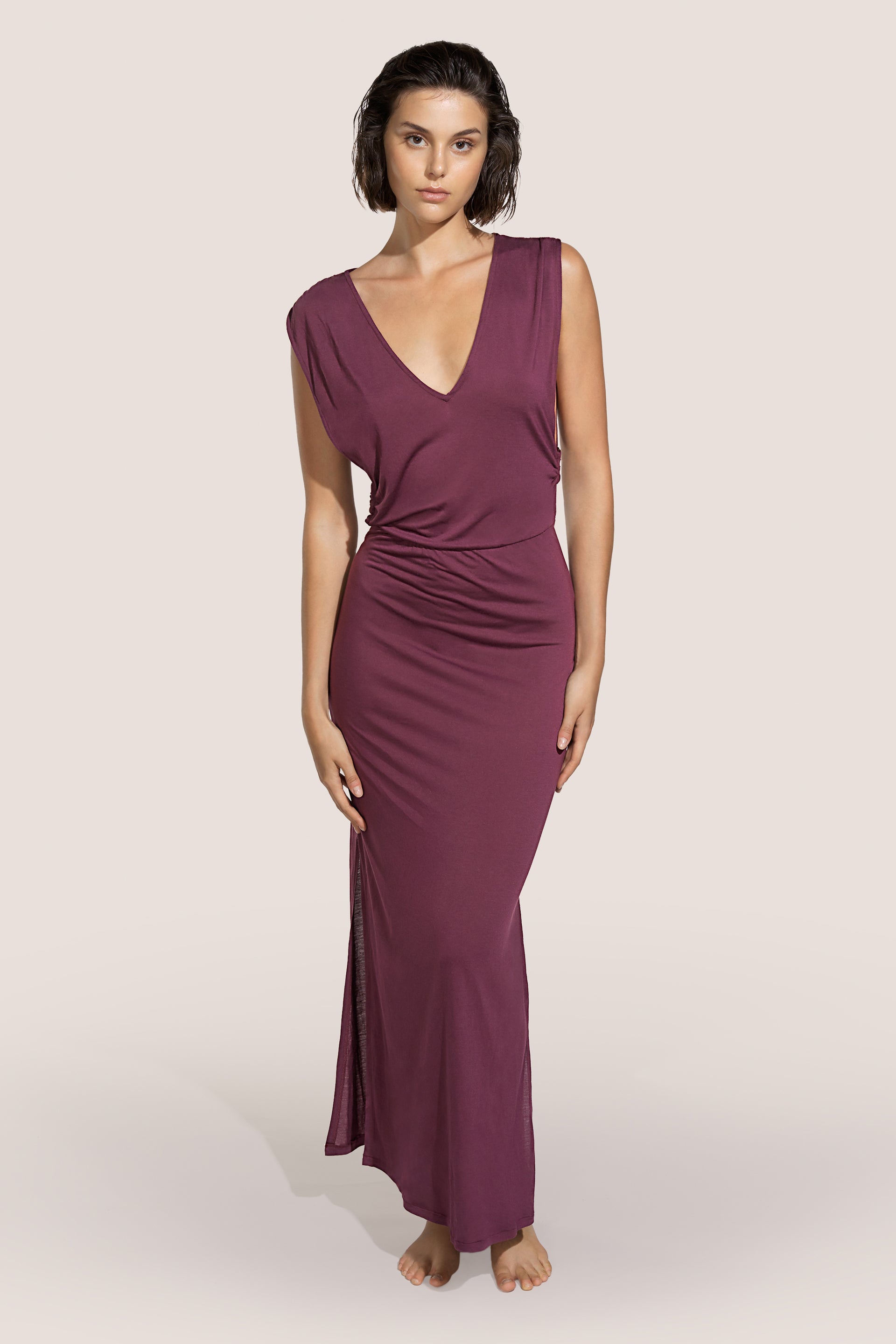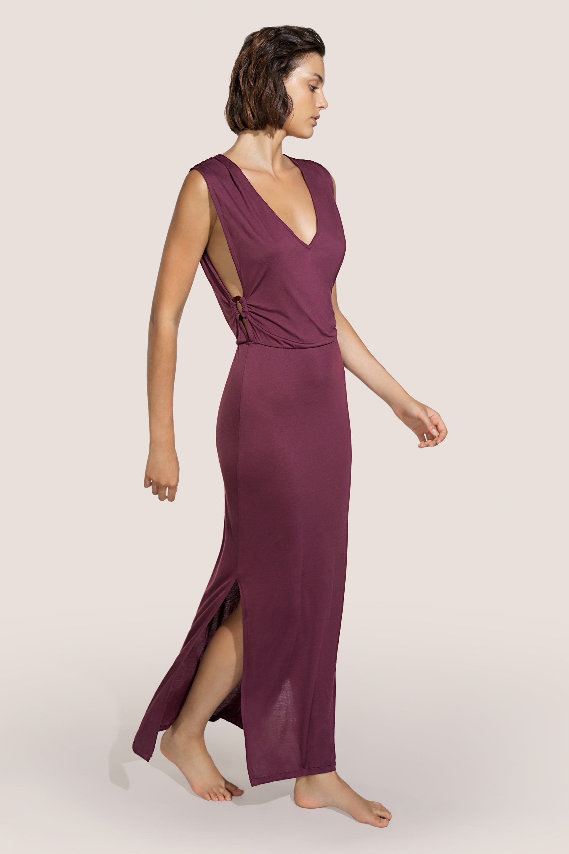 Elegante y sinuoso vestido largo de corte sirena, envolvente y suave, con profundo escote en pico sin mangas y aberturas laterales adornadas con anillas tono sobre tono.