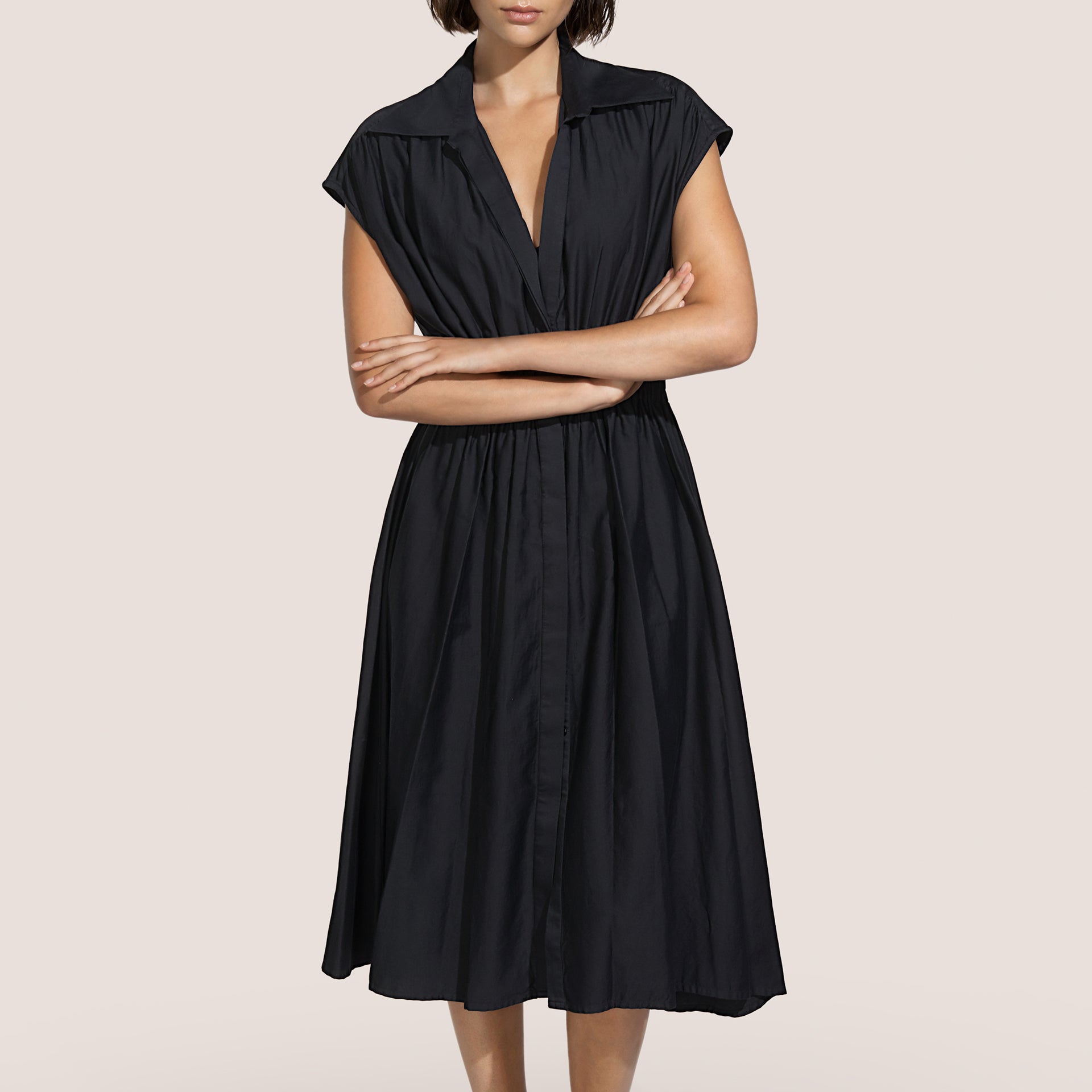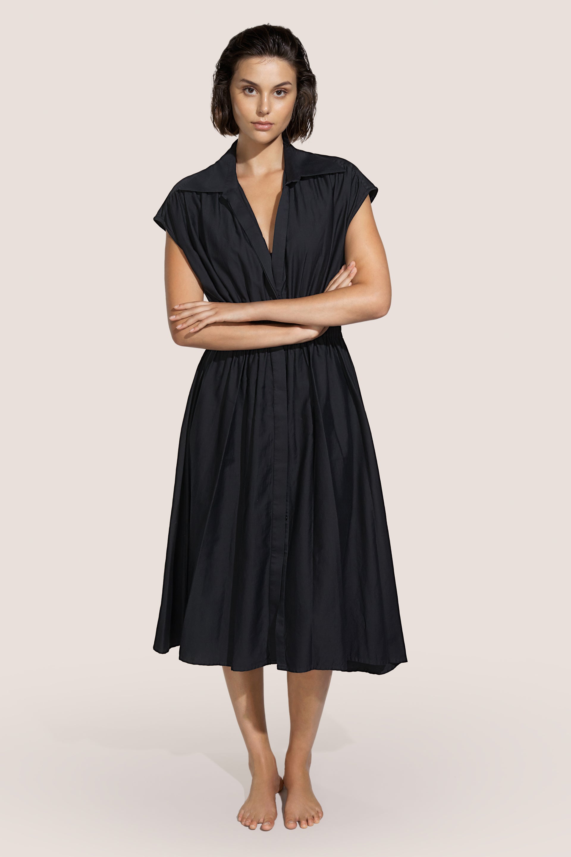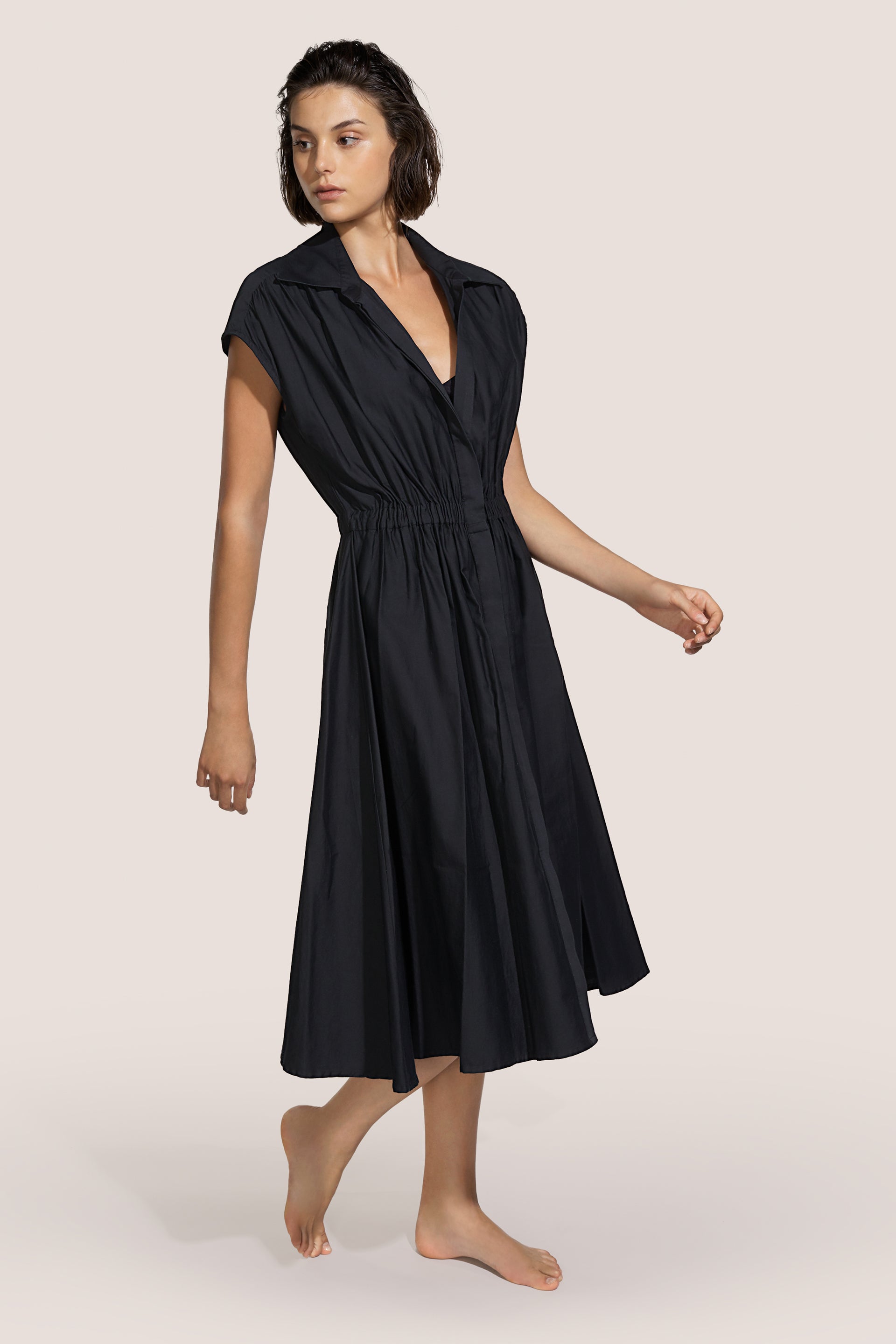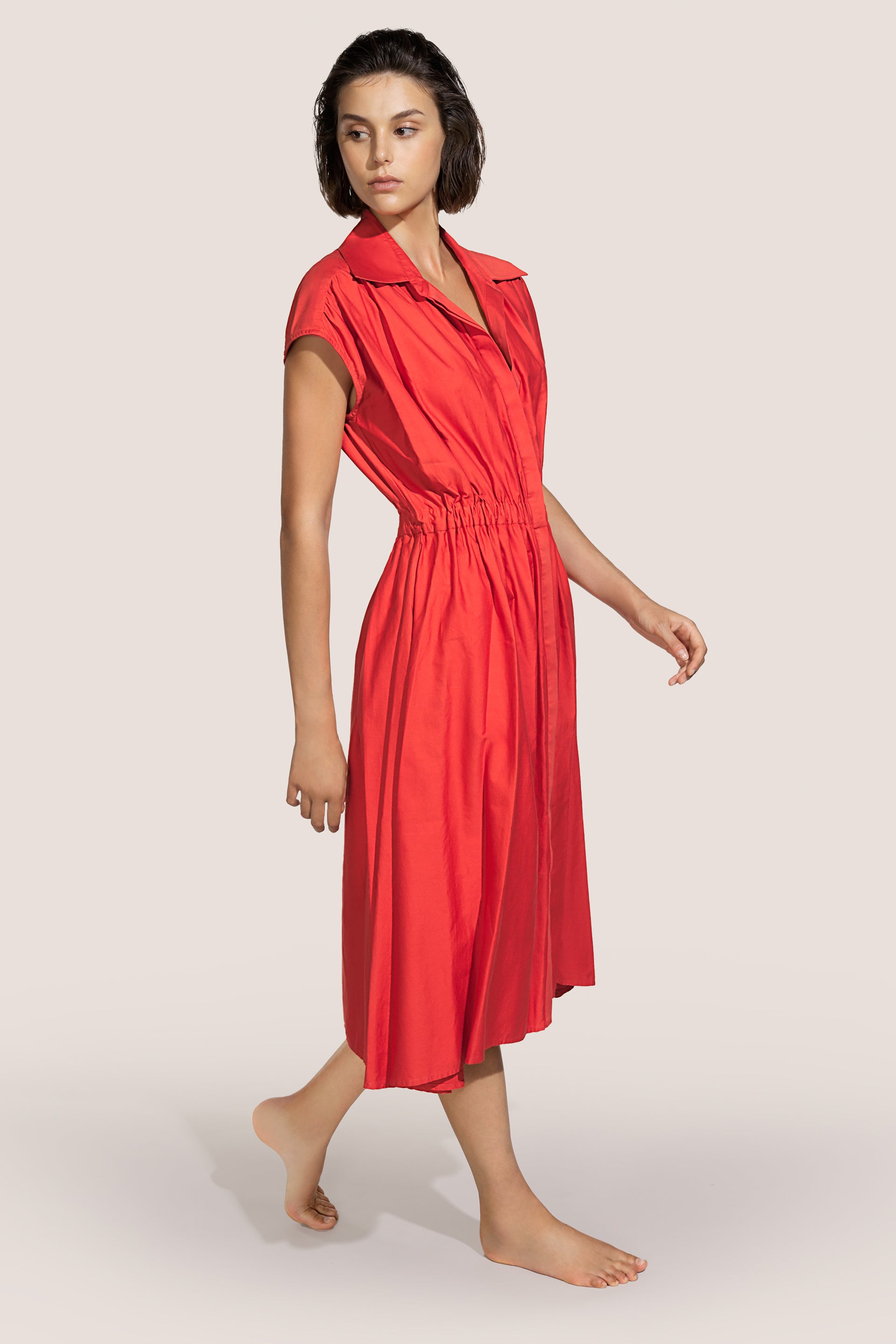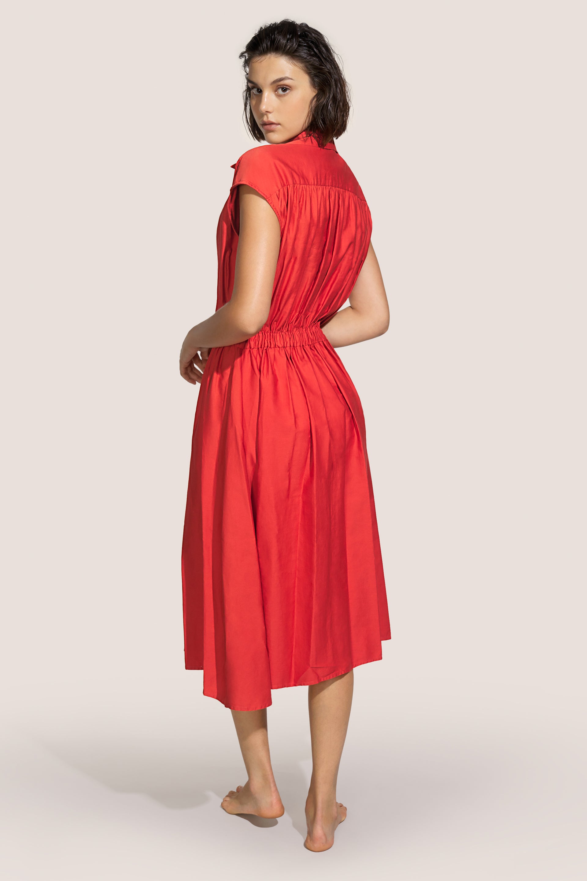 Vestido en algodón, cuello camisero, ligero detalle en los hombros que permite realizar pliegues en la parte delantera y trasera, elegante elástico en el cinturón y cierre de botones. Falda muy fruncida y ancha a la altura de la rodilla.